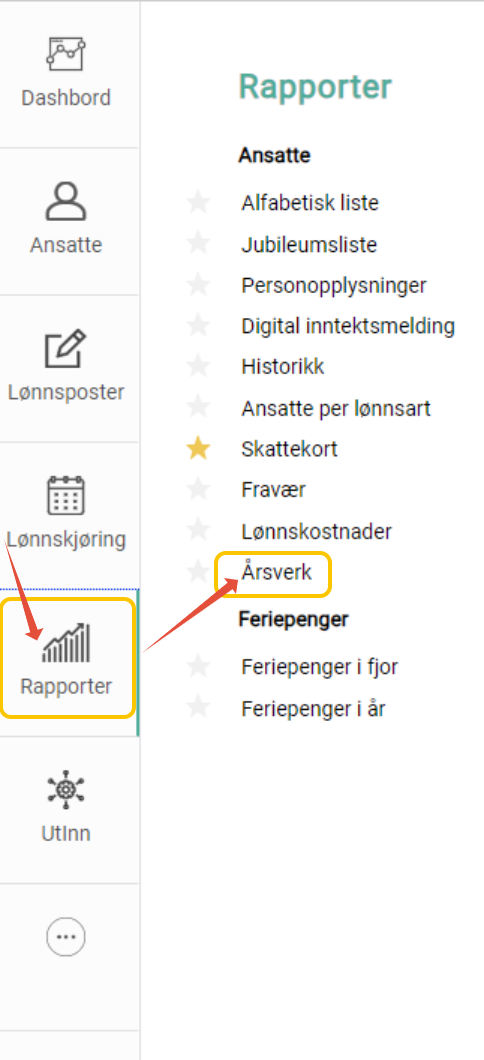 I Nettlønn, kan du ta ut rapporten «Årsverk» under menyvalget «Rapporter», og legge denne ved andre rapporter som sendes til regnskap ved årsavslutning.
