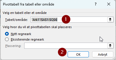En ny dialogboks kommer opp og i “Tabell/område:” ser du hvilke data som blir med til Pivot tabellen. Sikre deg at området er korrekt og trykk ok: